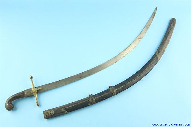 Up for sale is this good Turkish Shamshir saber, with a curved, single edge blade forged from good damascus steel (wootz) 29 inches long. Classical shape hilt with brass cross guard, grip strap and horn grips. Wood scabbard with black leather cover with spiral stitching and brass mounts with two carrying rings. Total length 36 inches. Good condition. Small reatoration to the handle. Leather cover to the scabbard is later. Very attractive price. |