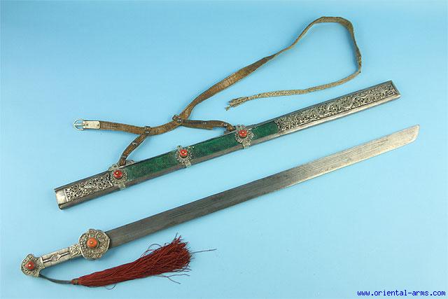 This very fine, large and rare Tibetan long sword (Ke-Tri) is mid - late 19 C. The blade is 30 inches long. It is forged from laminated steel folded at the tip of the blade (Hair pin folding) . Silver and White metal combination handle. The grip is bound with silver wire and both the pommel and guard are set with big coral bids. Scabbard of heavy steel frame, wood liners covered with green dyed ray skin and finely chased silver panels also set with coral bids. Total length 36 ½ inches. Very good condition . This sword comes with its original leather belt. Very impressive rare sword. |