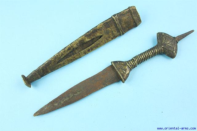 This ceremonial dagger is coming from Nigeria. 8 inches blade (crudely forged), with a cast brass handle and scabbard. Total length 16 inches. Good condition. Damage to the grip.