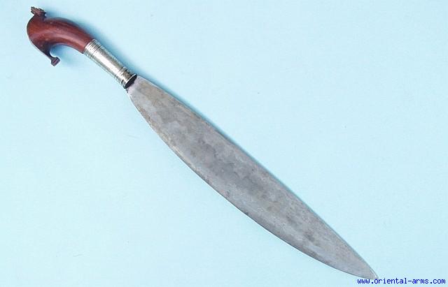 A good old Moro Barong. The Barongs heavy leaf shaped blades is known to have superior cutting abilities. This blade is 17 ½ inches long heavy and forged from laminated steel. The hilt is carved from a beautiful grained wood in the classical form, bound to the blade tang with a silver collar. The silver collar is engraved: (C)olin.C.Johnson, Bud Dajo, (?)arch 5-10-1907 (The lower silver ring covers the first letters of the inscription) . Total length 24 inches. There is no scabbard. Very good condition. Minor chips to the wood grip. |