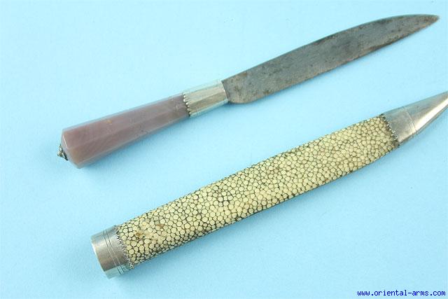 This small knife is most probably of German origin, late 18 C. Single edged marked blade with a down curving spine 4 ½ inches long. Grey color Agate handle with silver collar. Scabbard covered with rye skin and mounted with silver mounts. Total length 8 ½ inches. Very good condition. A small crack in the handle near the collar but it holds very solid. |