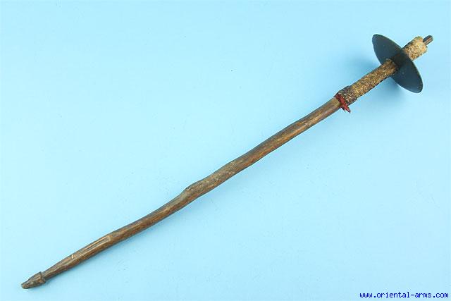This is a 19 C. war mace from Papua new Guinea, with a black stone elliptical shaped head, 5 ½ X 4 ½ inches, mounted on a 31 inches wood haft and secured in place by a wooden wedge and braided rattan sleeves. Very good condition, good age patina on the stone and the haft . Minor chips on the stone head. Quite a scarce item and an important addition to any weapon / tribal art collection. |