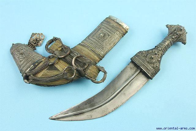 We offer for sale this fine quality Arab Jambiya dagger from Oman, in the royal style known as Saidi . It has a well forged, 8 inches long, curved and dual edge blade with a central rib. The hilt is made of Rhino horn in the classical “I” shaped, decorated with many small silver filigree pieces. The scabbard is “L” shaped covered with fabric. The belt attachment is made of complicate arrangements of 7 silver rings and twisted silver wire. All scabbard and hilt fittings are silver chased in a typical design. Very good condition. Very good age patina on the silver parts.