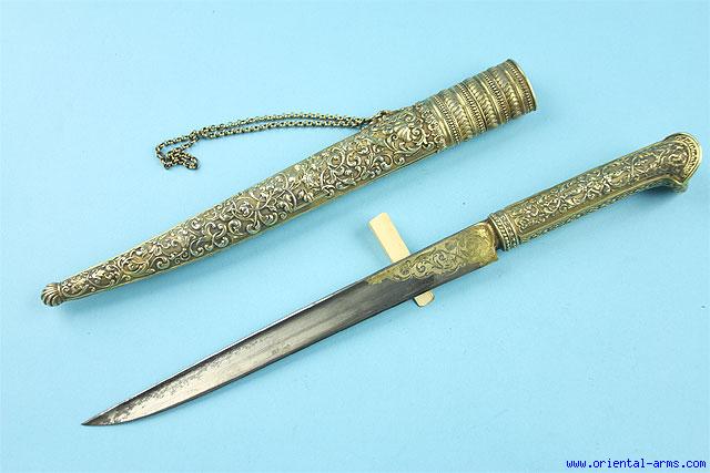 As best as it can get: This Bichaq knife is made by Manceaux a Paris. It is made for the Turkish market, probably to be acquired by a top official or high ranking officer. It is of utmost quality. The blade is forged from twisted steel 9 1/2 inches long with gold inlay work at the base. The handle and scabbard are made from heavy gilded silver with extremely fine chasing design. Total length 13 inches. Minor dark spots at the tip of the blade. A very fine and elegant item.