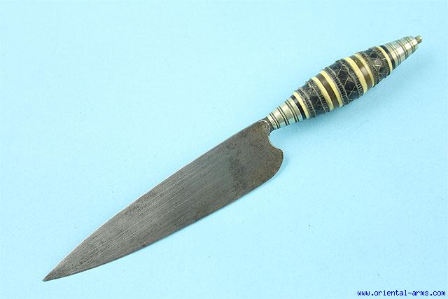 Up for sale is this knife from the Canary Islands in the Atlantic ocean. A single edge blade 5 ½ inches long, dot punched decoration on the one side. Hilt composed of alternating discs of horn bone and brass. Total length 9 inches. Very good condition. No scabbard. |