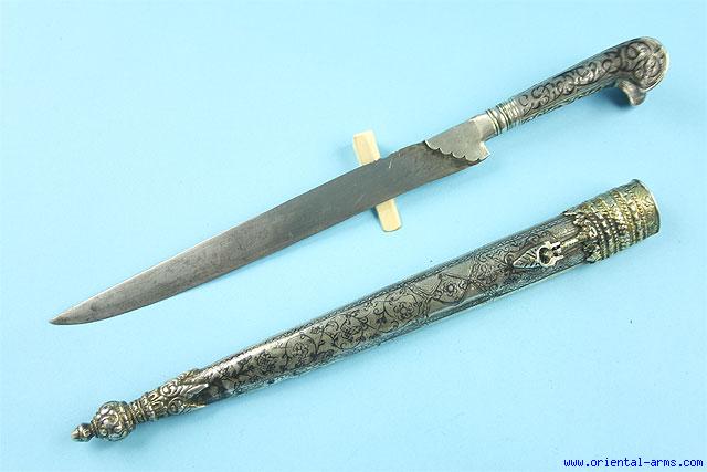 This beautiful knife is of Turkish origin and known as Bichaq. It has a single edge blade 10½ inches long. The hilt is black enameled (Niello) silver with “ears” in the Yatagan handles style. there is a red stone set between the ears. The scabbard is wood, covered with silver also decorated with niello work. Total length (in scabbard) 15 inches. Very good condition. All parts are original. |