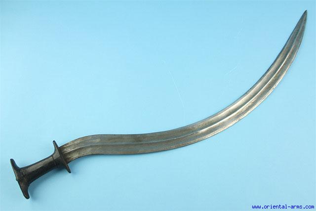 The Shotel is the traditional sword of the Abyssinian (Ethiopia). It looks like a huge sickle, with a long blade deeply curved almost to half circle. The purpose of this very awkward blade is to strike over or around the shield of an opponent. This one has a massive, finely forged blade30 Inches long, (point to point) 2 inches wide, with a central rib on its entire length. The hilt is made of three sectors of dark horn. Total length 35 inches. It is probably dated to the late 19th C. Very good condition. No scabbard. Original and authentic piece. No repairs or replaced or restored parts. |