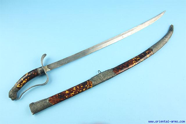 Up for sale is this very fine Vietnamese saber also known as Guom. The single edged grooved blade is slightly curved, engraved in a classical Vietnamese style, 28 inches long. The hilt is composed of wood covered with tortoise shell with silver lion head pommel and copper silver cross guard and D guard inlaid with silver in a beautiful pattern. The scabbard is wood also covered with tortoise shell with fine chased silver fittings. Total length 37 inches. Very good condition. A very fine piece. |