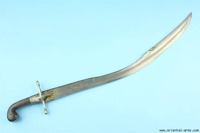 The Kilij is the traditional saber of the Ottomans. It was in use from the early 17 C. and during more than 300 years well into the 20th C. The shorter version with deeply curved wide blade and ‘T’ spine, sometime known as Pala, is a later version and appeared in the mid 18 Century. This Pala has a blade of 28 inches, well curved and forged from sham steel and decorated with gold koftgari work. The hilt of classical form is made of silverd brass cross guard horn grips and grip strap. Total length 31 inches. Very good condition. No scabbard