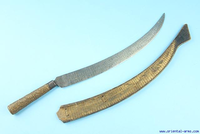 Up for sale is this very rare long knife / short sword from the aborigine tribes of Taiwan (Formosa). The heavy single edge up-curving blade is 19 inches long Wood grip with beautifully braided rattan cover. Open side scabbard with a steel wires holding the blade in position. Total length 29 inches. Very good condition. |
