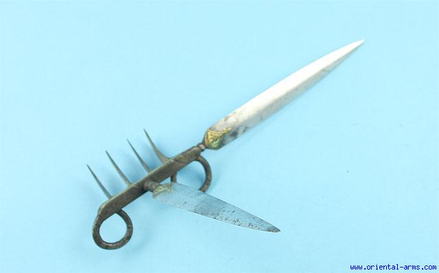 This rare and interesting wepon is Indian, early 19 C. or earlier, also known as Bagh Nakh meaning : Tiger Claws. It is composed of several small and curved blades on a connecting bar and rings for the fingers. This exemplar had four claw blades and two longer dagger style blades. Blades 5 inches, claws 2 ½ inches. Both the blades and the bar are decorated with gold inlay work and inscriptions. Very good condition. An interesting but cruel weapon, never considered as a legitimate fighting weapon. |