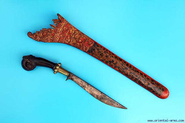 This fine piece is coming from Bali, Indonesia. It is a ceremonial knife, with some resemblance to the Wdung Knife ( also coming from Bali). The blade is single edge 8 3/4 inches long, short compared to the scabbard length and quite heavy . The handle is carved horn with a big brass collar. The long scabbard is wood finely carved at its mouth and painted red black and gold. Total length (in scabbard) 23 inches. Very good condition. A fine piece of quality. For a similar piece, see Albert G van Zonneveld Traditional Weapons of the Indonesian Archipelago, page 74, Fig 287. |
