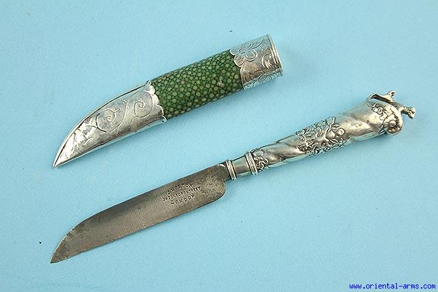 This small knife is English, late 18- Early 19 C made and signed by J. Morton. Single edged blade with a down curving spine 3 1.2 ½ inches long. Finely chased silver handle with an image of a small dog (?) at the pommel side. Scabbard covered with rye skin and mounted with silver mounts. Total length 8 ½ inches. Very good condition. |