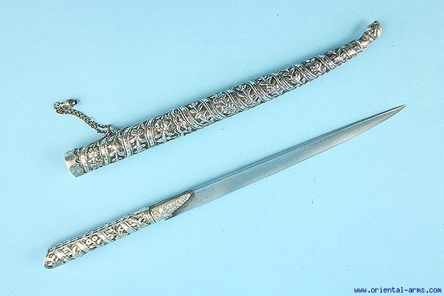 This fine knife is coming from the east Mediterranean, probably Turkish, second half of the 19C. Good sturdy 10 1/2 inches blade with a T spine. Whole finely chased silver handle and scabbard. Total length 17 inches. Very good condition/ Minor dents on the silver near the scabbard tip. Very elegant knife. |