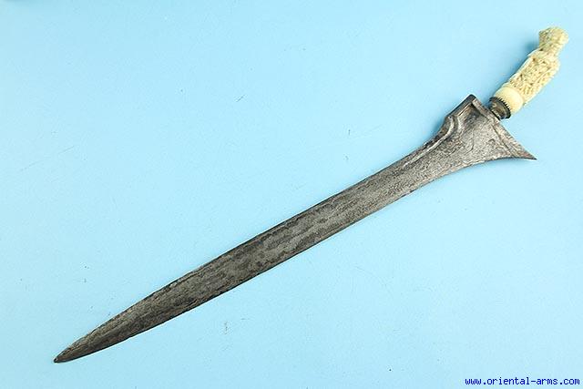 Up for sale is this fine keris dagger, Java, Indonesia. Early 20C. Good classical pamor blade 15 ½ inches long. Very finely and elaborately carved ivory grip of styled devil head (Raksasa). Silver mendak. Total length 19 ½ inches. Very good condition. No scabbard. |