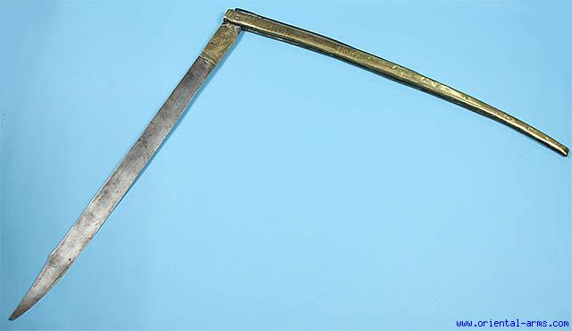 More than 62 inches (160 cm) long fully opened. 34 inches in closed position. Probably a late 18 C. piece. Blade 32 inches. The handle is engraved brass. Very good condition. Old age patina on the blade. Minor damage to the back tip of the handle. A rare and outstanding item. |