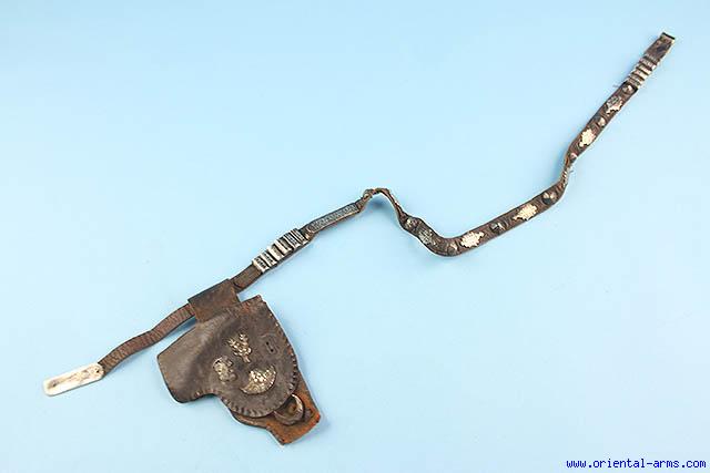 This belt and pistol holster are Caucasian, early 20 C. leather belt with nielloed silver mounts. The holster is also mounted with silver badges. Length 37 inches. Very good condition. Losses to the holster leather.