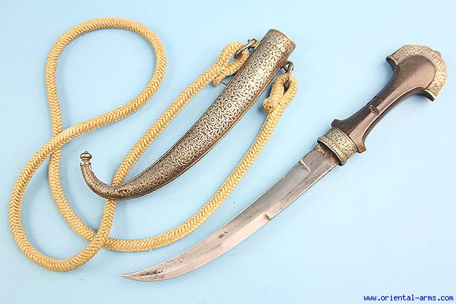 This Moroccan Koumaya dagger is a fine exemplar, 20C. vintage. Very well forged blade 9 inches long. Rhino horn grip with silver mounts, with the pommel stamped and dated 1390 ( 1970 in the Gregorian calendar). Heavy silver scabbard finely chased and engraved with Arabic inscription. Original baldric carrying rope. Fine condition. Few bug bites on the grip. |