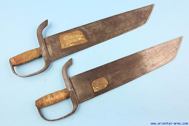 This is a good set of two Chinese short swords in a common scabbard. These swords are sometimes related to the Boxer wars in the turn of the 20 C. but they are not necessarily so, although the dating to the early 1900’s is correct. Heavy, wide blades, 16 inches long 3 inches wide. Steel cross guards with D guards. Wood grips bound with ropes. Total length 19 inches. Very good condition. No scabbard. Old labels are attached to the blades. |