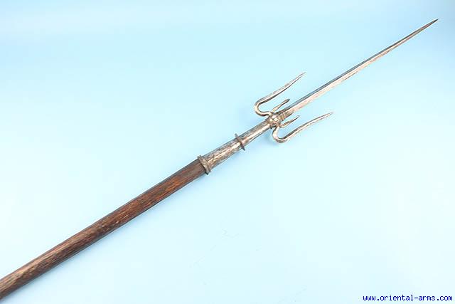 This large and unusual spear is Indian, early 19 C. or earlier. The spear blade is of rectangular cross section 19 1/2 inches long. Four spikes are mounted at the bottom of the blade. Two 6 inches long each and two reversed 2 inches long each. The blade is mounted via a steel socket 7 inches long on a thick wood haft with a conical shaped steel tail. Total length 93 inches. Very good condition. Age cracks on the haft but it holds very solid.