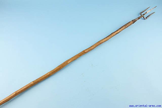 This trident spear is African but we are not sure were exactly in Africa. The three pronged steel head is 4 inches long with a 4 inch steel socket. Wood haft. Total length 54 inches. May be a fishing implement, early - mid 20C. Very good condition.