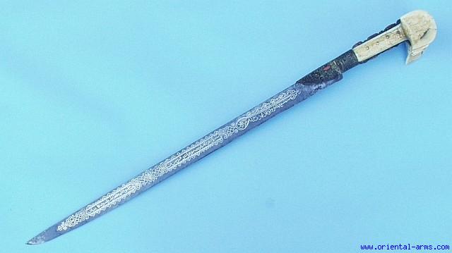 We offer for sale this unusual fine Yatagan with an 18 C. blade highly and richly decorated with silver wire inlay. The real inlay work is done by cutting grooves into the steel and hammering a silver wire into the groove (see close-up photos), in contrary to the later Koftgari decoration employing superficial hammering of silver into the scratched steel surface. This unusual blade is straight and not curved like the common Yatagans. It is 22 inches long, inlaid with silver wire on it entire surfaces both sides in floral design and Arabic inscriptions. Although the blade is not dated, the silver inlay work is of the second half of the 18 C. The grips are huge, 4 ½ inches tip to tip carved from single massive pieces of Walrus ivory. The grip strap and bolster are gilded silver in filigree work and set with very big carved Coral pieces. Total length 28 ½ inches. A very impressive item in good condition. Few pitted spots on the blade and age hair thin cracks on the Ivory. More than 95% of the silver inlay is intact. No scabbard. |