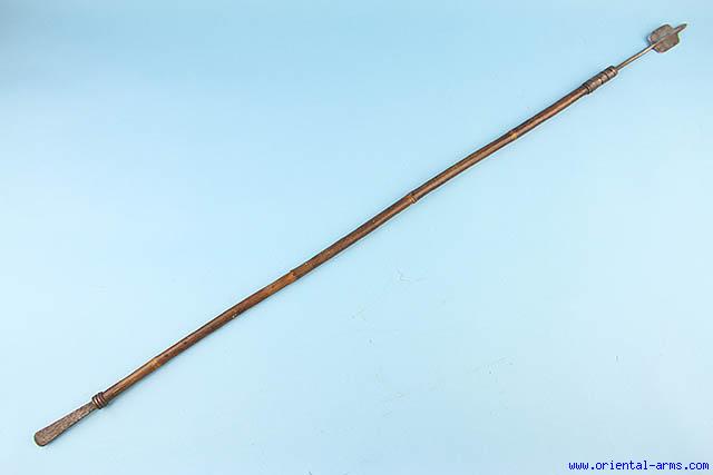 This short spear is of unusual shaped blade, 7 1/2 inches long (tang included) Bamboo haft with a steel tail. Both the blade and the tail are held tight with spiral steel strips. Total length 48 1/2 inches. Very good condition. Africa, early 20C. exact origin unknown |