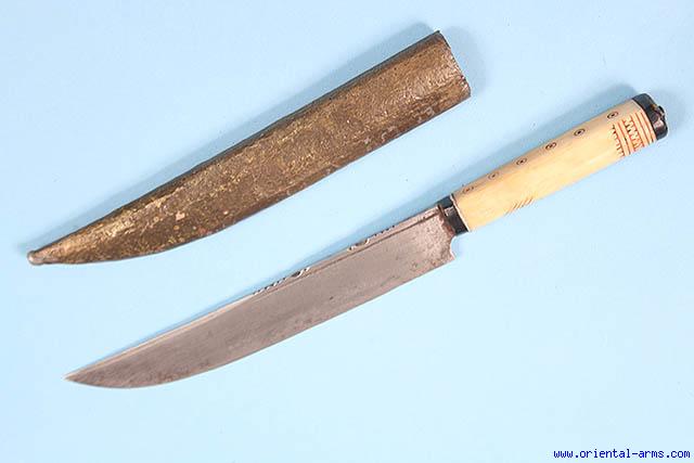 A knife from Bosnia, late 19 - early 20 C. Blade 7 1/2 inches with filed spine. Horn handle. Brass covered wood scabbard. Total length 12 inches. very good condition. The blade and scabbard are of classical Bosnian shape but the handle is a bit not usual. It may indicate a later replacement. Very low price. |