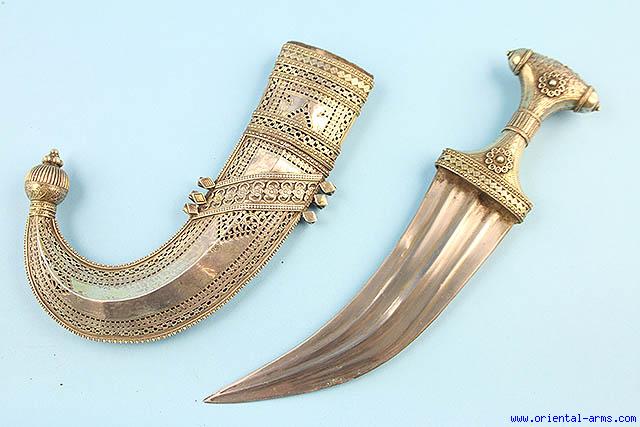 This very fine Arab Jambiya Dagger is known as Mecca style characterized by the silver scabbard and uprising scabbard tip. It is not necessarily from Mecca and can be found in many regions around and as far as Hadramouth in South Yemen. Early to mid 20 C. The blade is of fine quality, Big size, 9 inches long with two central fullers. The grip is silver finely engraved and set with filigree panels. The scabbard is a piece of arts on its own in heavy pierced engraved and filigree silver. Very fine condition. An outstanding piece for the serious collector of Arabic weapons. |