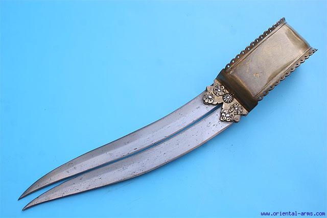 This dagger is a Double Blade Bichwa, a scarce weapon in the Indian arsenal, meaning: ‘The Scorpion Sting’. It is probably 19 Century. The blades are double edged, re-curving, 10 inches long, with a flat diamond cross section. The hilt is brass, ring shaped, riveted to the top of the blades and pierced along the edges. Total length 14 1/2 inches. Very good condition. No scabbard. |