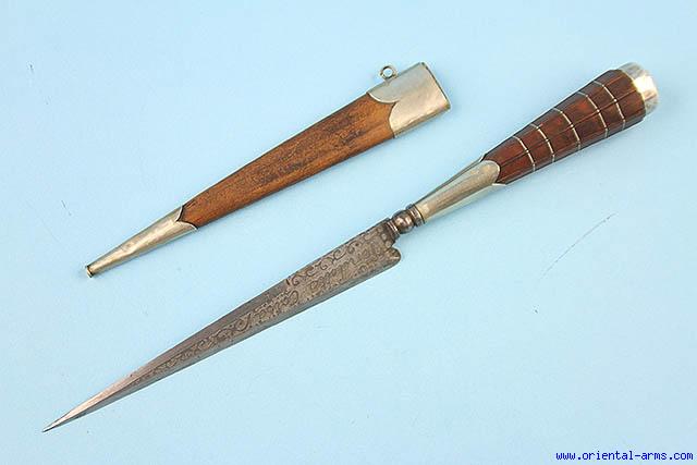 We offer for sale this beautiful Vendetta knife from Corsica, mid 20C. and one in perfect condition. These knives was used exactly for the purpose they are called: To brutally settle disputes in the family honor name. Blade 6 ½ inches with 4 inches back edge tapering to an acute tip. Wood grip with silver fittings. Wood scabbard with silver fittings. Total length 12 inches. |