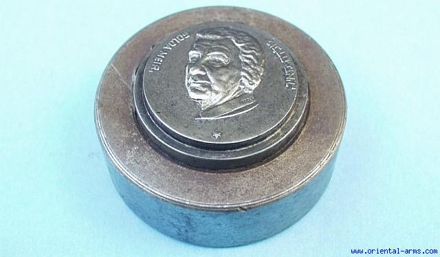 An original hand made die stamp of the medal of Mrs. Golda Meir, the Prime Minister of Israel during 1969-1974. Most probably the only one of its kind. Very good condition. Unique piece. Add 10.00 Dollars for air mail shipment.