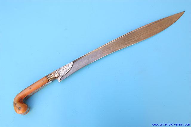 Up for sale is this very interesting combination of the two representing swords of the Turkish culture: Kilij and Ytaghan. This sword employ an early 18 C. blade forged from fine twisted steel in the pattern known as Turkish Ribbon . It was mounted with a later, 19 C. Kilij shape handle, with horn grips and silver grip strap and bolsters. Blade 17 1/2 inches. Total length 23 inches. Very good condition. No scabbard. |