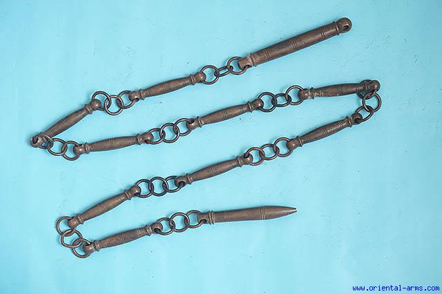 KAU SIN KE A fighting chain. A very interesting Chinese weapon. It is 57 inches long chain composed of nine brass links, a brass handle and a brass cone shaped weight at it end. Overall very good condition. An unusual and attractive 19th Century item. |