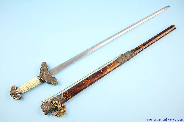 This straight, double edge sword is Vietnamese, early 20 C. , also known as Kiem. Its narrow long blade is 26 inches long of shallow diamond cross section. The handle is composed of grip made of very rare fossil tooth (Mammoth ??) and mounted with big chased silver pommel and cross guard. Wood scabbard covered with tortoise shell and with beautifully chased silver mounts. Total length 34 1/2 inches. Very good condition. The tip of the scabbard is a thin ivory disk (may be a later replacement). |