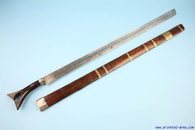 A Sikin sword. This one is probably Acheen from Sumatra, late 19th C. The blade is straight and single edge 27 inches long with a shallow fuller on its entire length. The steel bolster is forged in a polygonal shape. The hilt is carved of horn in a typical forked pommel. The scabbard is made of dark hardwood with white metal bands. Total length is 32 inches. Very good condition. Few small pitted spots and few nicks on the edge. Minor losses to the scabbard. A good complete sword. |