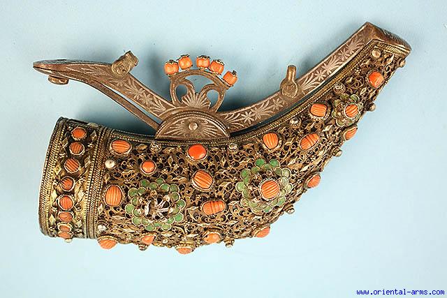 This very fine flask is Ottoman, early 19C. Very well made and decorated with gilded filigree panel set with coral stones and enameled flowers. Silver inlaid steel lever and mechanism (In full working order). Length 7 1/2 inches. very good condition. Small repairs on the back side. |