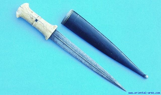 This superb dagger is also known as Ottoman Court Dagger. it was a side arm of the nobilities visiting the courts of the Ottoman empire in the 17 and 18 C. The blade is flat with a central rib, 9 ½ inches long, tapering to an acute tip. It is forged from good Damascus steel, but needs polishing and etching to bring out the pattern. The grip is walrus ivory pierced at its center and the scabbard is wood covered with black leather (recent), ending with a small ball tip. Total length (in scabbard) 15 inches. Very good condition. Few pitted spot on the blade. a small chip and very old repairs on the pommel. |