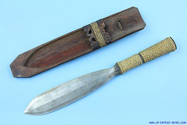 The Igorot people from the mountainous region of Luzon in the Philippines uses this dagger also known as Hinalung. This very good exemplar is mid 20C. The spear shaped blade is 7 ½ inches long is well forged in one piece with the hollow handle. The grip is covered with braided rattan strips. It is housed in an open wood scabbard bound with Braided rattan strips. Total length (in scabbard0 13 inches. Very good condition. Grinding signs on the blade. |