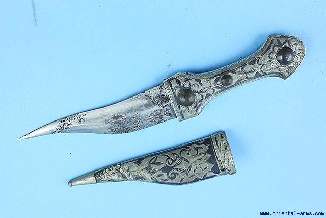 A very good example of the Bedouin side dagger locally known as Shibriya. All men carry it and it is very popular between the Bedouin tribes residing in Israel and in Jordan. The blade is 5 1/2 inches, re-curving and double edged with an acute tip. The grip as well as the scabbard are covered with engraved and nielloed white metal. Total length 10 ½ inches. Good condition. Minor pitted spots on the blade. Minor losses to the niello design. Belt loop missing. Early 20C. nice exemplar. |