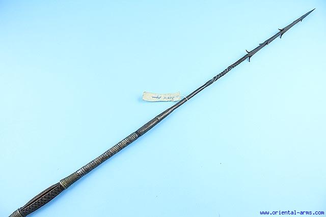 This very good harpoon spear is of the Yakoma people, early – mid 20C . Very long 28 inches heavy barbed blade and finely twisted tang. Wood haft with a central swelled handle bound with steel and brass and copper strips strips. Steel tail. Total length 60 inches. Very good condition. Attached to the spear is an old label inscribed: BENIN Nigeria. Very nice spear of a better quality then the average African spears. |