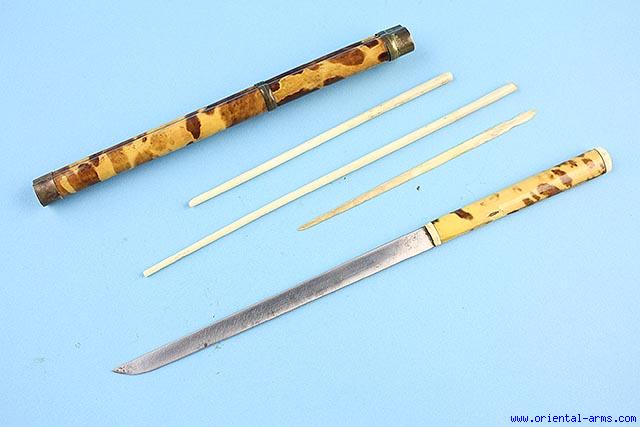 A Chinese ‘trousse’ (eating set), comprising a knife and chopsticks. This type of sets was very common in china and in all the countries under the Chinese influence from Tibet to Mongolia. It was part of a man formal dress up to the turn of the 20th century and usually accompanied with a variety of accessories like pickle spear, toothpicks, tweezers and the like. Similar sets are found in various sizes and quality. This one has a 6 inches slender steel blade. The handle and the scabbard are wood (probably Bamboo) covered with tortoise shell like cover with ivory pommel cap and brass mounts. Chopsticks are bone (one broken). Total length 10 ½ inches. Very good condition. Minor losses o the tortoise shell. |