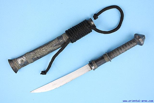This small and knife is Thai, late 19 C. Blade 5 1/2 inches. Silver covered handle and scabbard with fine silver filigree bands. Onion shaped pommel. Total length 12 inches. Very good condition. Small dent n the pommel. The black thread on the scabbard is later. |