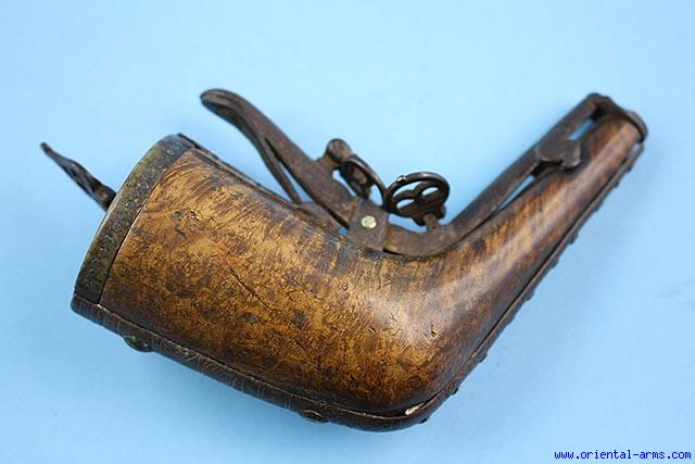 This powder flask is most probably of Caucasian origin (but similar ones can be found also in Persia). Made of Caucasian walnut - beautifully grained hard wood. 6 inches long. Steel mechanism in full working order, steel mounts and steel band around. Very good condition |