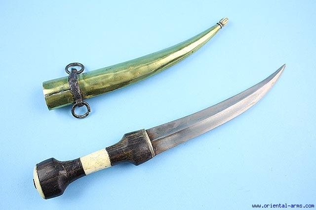 This Khanjar is Of Iraqi origin but with strong Turkish influence. late 19 - early 20 C. with a curved double edge blade forged from a good Sham wootz. Blade length 8 inches. Wood / Bone handle. Brass scabbard. Total length 14 1/2 inches. very good condition |