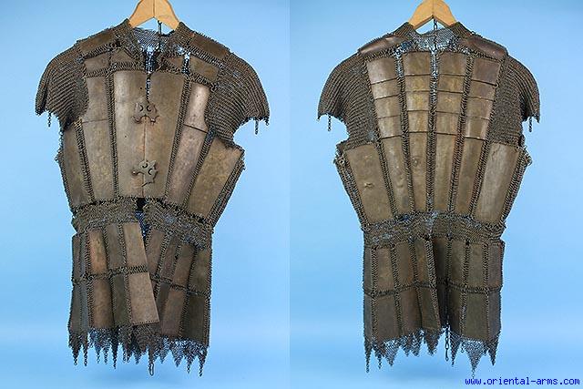 Up for sale this rare and beautiful Complete Moro Armor from the Philippines. The armor is constructed from brass plates connected with brass rings, with two brass buckles on the chest plates in a way copying the Indo-Persian plate and mail armor. 26 inches High 21 wide. Very good condition. Several rings are missing in few places. One of the buckles is lightly damaged. |