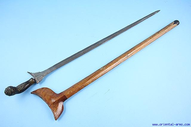 A Keris Penjang , also sometimes referred to as Execution Keris from Sumatra, late 19 -early 20 C. The blade is 25 inches long, forged from pamor steel and nicely fullered. The hilt is horn. No mendak. Fine wood scabbard with horn tip. Total length 31 inches. Very good condition. |