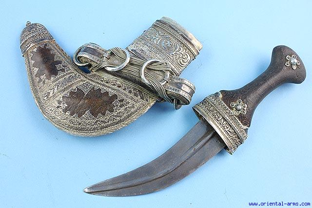 A fine Arab Jambiya dagger, early 20 C. from Oman. It has a 6 inches curved and dual edge blade of good steel with a pronounced central rib. Hilt carved from rhino horn with a chased silver collar. The scabbard is “L” shaped covered with leather elaborately embroidered with silver strips and wires, and mounted with chase silver locket en suite with the hilt mounts. The belt attachment is made of complicate arrangements of silver rings and twisted silver wire. Total length is 12 inches. Very good condition. |