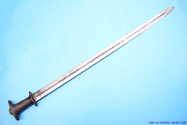 Up for sale is this very good Saif sword from Ethiopia, early 20 C. The blade is a typical trade blade, well forged and finally fullered, 34 inches long. Three sectors horn handle with a dome shaped brass pommel. Total length 38 1/2 inches. Very good condition. Minor edge nicks and minor chips on the handle. No scabbard. A very impressive sword. |