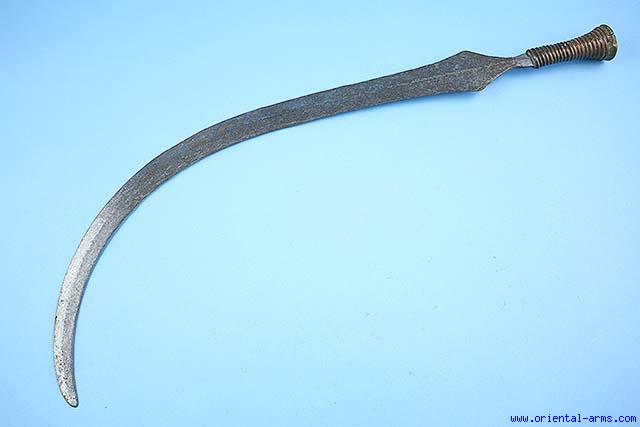 This sickle shaped sword is coming from Zaire, Africa, most probably the Ngombe people. Very finely forged steel blade of flat diamond cross section and lightly engraved and inserted with copper inserts. Hardwood handle bound with copper strips. Blade 20 inches, total length 23 inches. Very good condition. |